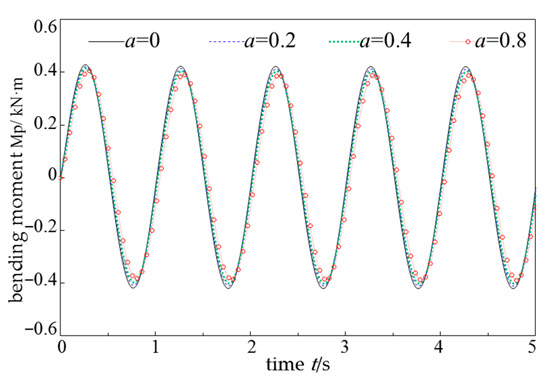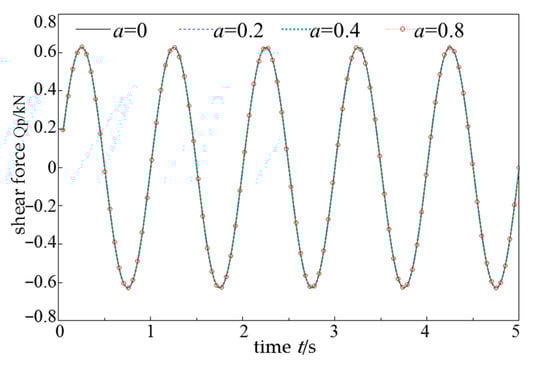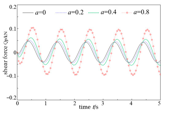 Figure 11 and Figure 12 show the distribution of pile bending moment and shear force with depth at t = T/4, respectively. Figure 11 shows that as the viscosity order increases, the positive bending moment of the pile decreases while the negative bending moment increases. Figure 12 shows that as the viscosity order increases, both the positive and negative shear forces will increase. However, it should be considered that due to the delay effect, the bending moment and shear force values at t = T/4 cannot represent the peak values at each viscosity order. Therefore, Figure 13, Figure 14 and Figure 15 show the time–domain response of bending moment and shear force at the characteristic depth. Figure 13 shows that there is also a delay effect in the bending moment of the pile body, and as the viscosity order increases, the amplitude of the bending moment decreases slightly. Figure 14 shows that the shear force at the top of the pile is almost unaffected by the viscosity order, and there is no significant delay effect or amplitude change phenomenon. Figure 15 shows that at larger depths, there is a significant delay in shear force, and the larger the viscosity order, the greater the shear amplitude.