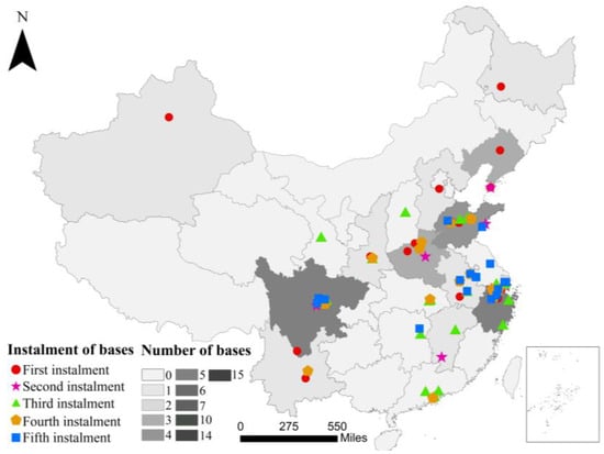 The data used in this article come from the list of smart health and elderly care demonstration bases published by the Ministry of Industry and Information Technology. The spatial data come from the map database of the National Basic Geographic Information Center (www.ngcc.cn) (accessed 1 October 2023). The spatial attributes such as the longitude and latitude of the smart health and elderly care demonstration base are obtained with the help of the Baidu coordinate picker and Amap, and the spatial analysis is drawn using ArcGIS 10.2. Isometric graphics. The GDP of each province comes from the China Statistical Yearbook, as well as the provincial statistical yearbook and the provincial National Economic and Social Development Statistical Bulletin of the corresponding year. In view of the reliability of the data, the statistics in 2022 shall prevail.