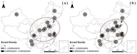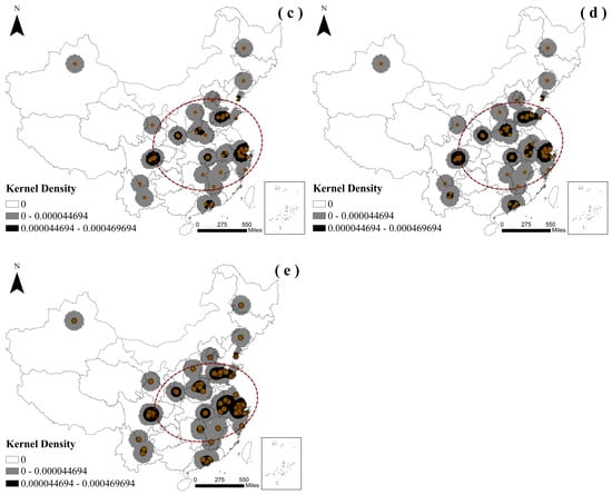 Leveraging the capabilities of ArcGIS 10.2 software, we undertook a sophisticated examination of the spatiotemporal distribution of smart healthcare and geriatric care facilities across China for the five-year period spanning from 2017 to 2021. Employing advanced statistical methodologies, including kernel density estimation and the standard deviation ellipse analysis, we unravelled the intricate patterns and trends within the dataset. The fruit of this analytical labor is meticulously laid out in the sequence of graphical representations, as depicted in Figure 3a through Figure 3e.