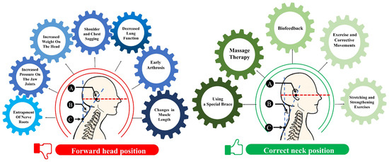 The initial phase of addressing ailments related to the head and neck necessitates thorough evaluation by a specialist in physical medicine and rehabilitation complemented by radiographic assessments to gauge the progression of the condition. Subsequent to this comprehensive assessment, a tailored treatment regimen is prescribed encompassing specialized exercises and an array of therapeutic interventions. Several therapeutic modalities warrant consideration, including stretching and strengthening regimens, offered by a physical medicine and rehabilitation specialist as a series of exercises [10], utilization of a bespoke orthopedic apparatus such as an orthopedic device (e.g., braces or lumbar supports) designed to facilitate optimal bodily posture [11], manual techniques such as the application of massage therapy [12], structured physical exercises or corrective movements [13,14], and biofeedback techniques such as therapeutic–educational modalities wherein individuals are instructed on the volitional regulation of innate autonomic physiological functions to influence overall bodily wellbeing [15].