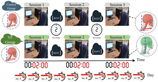 Experimental protocol. The experiment contained three experimental sessions with two interval rests. The first and last sessions were identical for both groups. Moreover, the second session of the control group was similar to the other sessions. However, in the second session of the VF group, visual feedback was provided for the participants to help them keep their heads in the correct position.