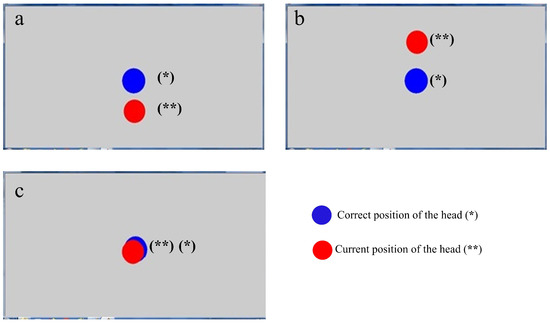 A view of the monitor during the execution of the program in the third phase of the experiment. The blue circle is the reference in the middle of the screen and shows the proper position of the head, while the red circle shows the instantaneous position of the head: (a) when the head is behind the proper position, (b) when the head is ahead of the proper position, and (c) when the head is in the right position. The red circle can appear on the right or left side of the blue circle to indicate the head’s inclination to the right or left side, respectively.