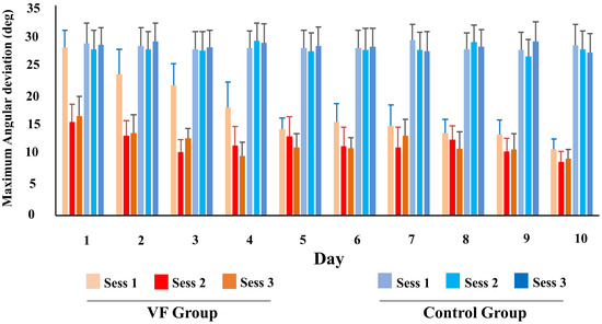 Maximum angular deviation of the head. The data for the VF and control groups are presented over a ten-day period. The data are represented in three sessions: Sess. 1, Sess. 2, and Sess. 3. The values are expressed as mean values with corresponding standard errors.