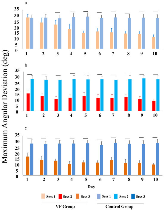 Maximum angular deviation of the head; the data for the VF and control groups are presented over a ten-day period. The data are represented in three sessions: Sess. 1 (a), Sess. 2 (b), and Sess. 3 (c). The values are expressed as mean values with corresponding standard errors. The horizontal black lines represent the significant difference between groups. The level of significance is set at p < 0.05.