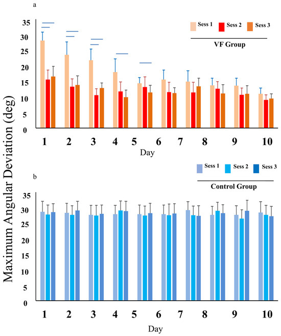 Maximum angular deviation of the head. The data are presented over a ten-day period for the VF (a) and control (b) groups. The data are represented in three sessions: Sess. 1, Sess. 2, and Sess. 3. The values are expressed as mean values with corresponding standard errors. The horizental black lines represent the significant difference between sessions. The level of significance is set at p < 0.05.