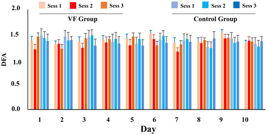 DFA number; the data for the VF and control groups are presented over a ten-day period. The data are represented in three sessions: Sess. 1, Sess. 2, and Sess. 3. The values are expressed as mean values with corresponding standard errors.
