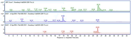 To determine the optimal extraction conditions for obtaining a fraction rich in low molecular phenolics the percentage content of specific compounds in the total yield of the obtained extract were considered. Water is the most environmentally friendly solvent with good swelling properties. However, the extraction efficacy of the main strawberry phenolic components using pure water was poor. Phenolic compounds content was very low or they were absent (Figure S2). Despite the ultrasound, or microwave treatment facilitating the release of various metabolites from the plant matrix, the low solubility of tiliroside and ellagic acid proved to be the main cause of low efficiency in isolation using water.