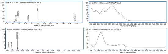 Mass and UV-Vis spectra of tiliroside (upper panels) and ellagic acid (lower panels).