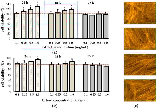 In general, at the tested concentrations, the extract was non-toxic throughout the entire evaluation period. Furthermore, after 24- and 48-h exposures to the highest tested concentration, both cell proliferation and cell metabolism were stimulated, increasing up to 132% in MTT and 115% in NR tests after 24 h. After 48 h, the values rose to 118% and 109%, respectively, compared to the untreated control. No negative impact on cellular cytoskeleton was also observed (Figure 4c).