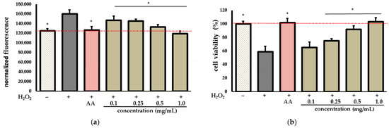 Effect of extract in human skin fibroblast cells on (a) 2′,7′-dichlorodihydrofluorescein fluorescence and (b) cell viability assessed using NR test. The cells were pretreated with different extract concentration and exposured on H2O2. The data are means (n = 3) ± SD. * Indicates statistically significant difference vs. H2O2-stimulated cells (p < 0.05).