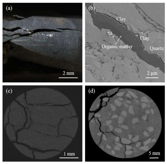The extraction of natural gas from shale presents a highly promising and environmentally sustainable alternative to traditional fuel sources [1]. Shale gas, known for its relatively low carbon emissions, possesses the potential to address escalating global energy requirements. Therefore, the development of advanced shale gas extraction technologies has emerged as a prominent subject at the forefront of scientific and technological advancements [2,3]. In order to efficiently extract shale gas from micro- and nano-scale gas-containing pores and fractures (Figure 1), hydraulic fracturing is required for shale reservoirs. The fracture network generated by hydraulic fracturing in shale reservoirs contains numerous microfractures. These microfractures serve as crucial pathways, allowing shale gas to flow from micro- and nano-scale pores towards macroscopic fracturing fractures and wellbores, thereby significantly improving the shale gas recovery rate [4,5,6]. However, the current academic and industrial focus is primarily on the evolution laws and affected volume of macroscopic fracturing networks, with less attention given to the microfractures connected to these macroscopic fracturing fractures [7,8]. As a result, there is a lack of in-depth understanding regarding their formation mechanisms, distribution characteristics, and dynamic propagation processes, which severely limits breakthroughs in improving shale gas recovery processes [9,10,11]. Therefore, an in-depth exploration of the causes, characteristics, and propagation patterns of the microfractures generated during the process of hydraulic fracturing in shale holds urgent engineering practicality and significant research value.