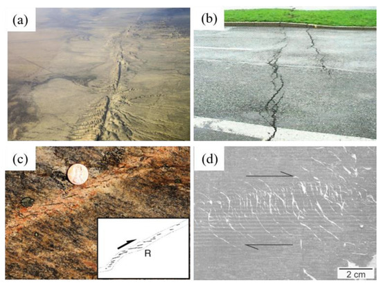 Figure 3. Macroscopic discontinuous fractures. (a) Aerial photographs of discontinuous en echelon faults. Credit: US Geological Survey. (b) Discontinuous fractures on the road surface [47]. (c) Discontinuous fractures forming during incipient stages of faulting [48]. (d) En echelon vein array in claystone [49].