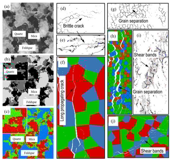 Figure 8. Simulation and modeling of microscale fracture propagation in rock based on mineral distribution. (a) Experimental testing of rock mineral distribution. (b) Utilizing digital image processing techniques to obtain a grain-based sketch. (c) Generating computational models based on sketches within numerical simulation. (dj) Simulation of microscale fracture propagation in rock [112].