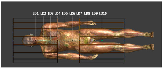 The models were placed inside 10 different cylindrical RF birdcage body coils from the Birdcage Library (BCLib, IT’IS Foundation, Zurich, Switzerland) with different dimensions as shown in Table 2. The resonant frequencies of the coils were set to 64 MHz for the 1.5 T system and 128 MHz for the 3 T system. Clockwise polarization was assumed, implementing a quadrature excitation by feeding the coils with two ports 90° apart in azimuth (polar) angle and phase. For each model, 10 different landmarks (LD1–LD10) were considered, with a 10 cm step from head to feet, where the center of the heart was kept on the craniocaudal axis (z-axis). The first landmark coincided with the RF-coil iso-center 10 cm below the head imaging position, as shown in Figure 1. In Table 3, the evaluated landmarks are matched to usual clinical imaging positions. In order to decrease the computational burden, a Huygens source was used, which was constructed from the field distribution provided by the birdcage coils of the BCLib, and uniform isotropic voxel size was assigned at the human models with a resolution of 2 mm. Full-wave electromagnetic simulations were performed until steady state was reached. Varying the number of the simulated periods from 7 to 15 was tested for convergence of the results; after 8 simulation periods, the deviation in the results was negligible. In particular, the deviation in the maximum electric field was less than 0.05%.