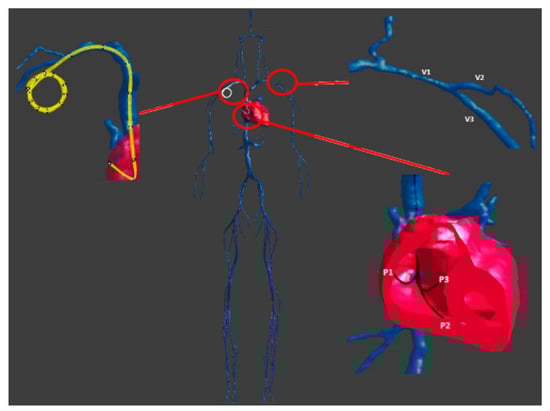 Based on the clinically relevant implantation paths as described in [42], the lead paths were terminated inside the heart at three different points, at the right atrium (point P1), at the septum wall (point P2) and at the apex of the right atrium (point P3), as shown in Figure 2. Then, the paths followed the superior vena cava to the subclavian vein and exited from the veins from three different possible points, the subclavian vein (point V1), the cephalic vein (point V2) and the axillary vein (point V3), respectively. This approach was followed for both the right and the left side of every human model, as depicted in Figure 3.
