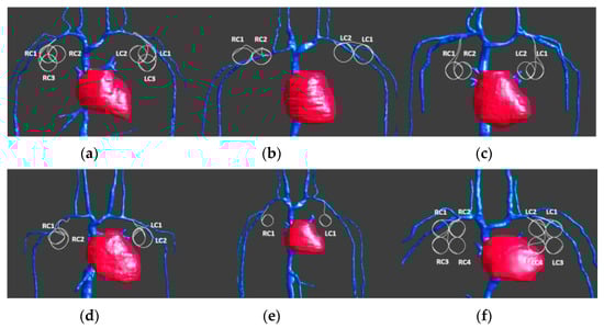 After exiting from the veins, the paths were terminated at the pectoral regions, at points where a connection of the lead to the IPG was assumed. However, the remaining part of the lead that left the vein was coiled before connecting to the IPG. The coiling of the lead was performed with two constraints, i.e., the flexibility of the lead (minimum allowed radius of curvature) and the subcutaneous space available inside the body (numerical phantom). In the present study, the coiling circles were chosen with a diameter between 40 and 60 mm. However, it was not possible to create the same number of different coiling circles in every human model or in either side of the same human model due to their anatomical characteristics. The total number of implantation paths that were identified in each human model (which are illustrated in Figure 3) is provided in Table 4. This number includes all cases: left- and right-side implantation, entrance of the lead through the subclavian, cephalic and axillary veins.