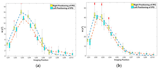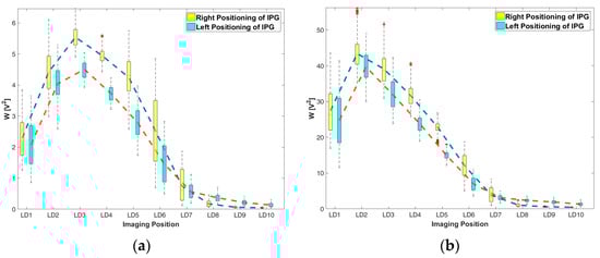 The investigation of the extracted tangential electric field along the paths of CIEDs inside the model of Duke at 1.5 T are shown in Figure 4, where the W values were separated for pathways leading to the right side of the patient from those leading to the left placement of the IPG device. The distribution inside the rest of the models is provided in the Supplementary Materials (Figure S1). In particular, the distribution of the W values over all the imaging positions is presented, where the input power of the coil was adjusted to generate B1+RMS = 2 μT at the iso-center (Figure 4a) or to assess the limiting value of the global SAR (Figure 4b). The dotted lines present the mean values of the W values. The most unfavorable scenario (with the highest mean W value) at 1.5 T, assuming a constant B1+RMS at the coil’s iso-center, occurred during thoracic imaging (LD3). Conversely, when fixed SAR was taken into account, the highest electric field was estimated during neck imaging. For both approaches, the electric field along the cardiac paths decreases with moving the human away from the center of the coil. Therefore, the selection of the appropriate imaging landmark is a dominant factor for reducing the deposition of the RF power at the tip of a CIED. Tables S1 and S2 in the Supplementary Materials summarize this obtained reduction in dB of the mean W value for each landmark relative to the worst case, where, at the low part of the lumbar and at the pelvis, the electric field reduced by more than 10 dB.