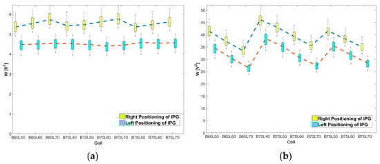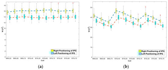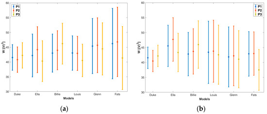Distribution of the W values for all numerical models regarding the insertion point of the paths (a) at 1.5 T and (b) at 3 T.