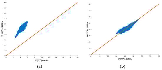 Regarding the impact of the resonant frequency on the induced electric field, the scatter plots in Figure 8 present the correlation of the W values for each path of the CIEDs inside the model of Duke, at LD3, as were estimated at 1.5 T and 3 T. When the power of each coil was adjusted to generate B1+RMS = 2 μT at the center of the coil, the electric field was significantly lower at 1.5 T than that at 3 T (Figure 8a), while, for the SAR fixed at the normal operation limiting values, the difference between the results of the two resonant frequencies was much lower. Figure 9 displays the resulting distribution in dB of the deviation between the electric field at both resonant frequencies for all numerical models. Assuming constant B1+RMS, the electric field was higher at 3 T along the cardiac paths than at 1.5 T from 1.5 to 5.7 dB. On the other hand, fixing SAR resulted in differences in the range of −1.7 to 1.6 dB, demonstrating that there are paths with a higher induced electric field at 64 MHz than at 128 MHz.