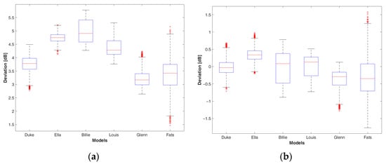 Distribution of the deviation in dB between the tangential electric fields at 1.5 T and 3 T over all the numerical models. The input power of the coil was adjusted to generate (a) B1+RMS = 2 μT at the iso-center and (b) the limiting value of the global SAR.