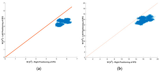 Scatter plot of the W values of the left placement of the IPG versus the right placement (a) at 1.5 T and (b) at 3 T. The red solid line corresponds to the equivalence of the two quantities.