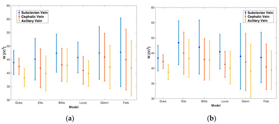 Furthermore, to associate the energy absorption at the implant tip with the location of the lead inside the human model, the estimated W values over all the coil configurations and imaging landmarks were grouped according to the veins where the lead paths were inserted, and the results are summarized in Figure 11 for both frequencies. Both right and left routes were considered, and the results correspond to the landmark LD3. In most of the human models, the highest calculated electric field was achieved along the subclavian vein, while the relative minimum was observed along the axillary vein. For both right and left paths and both resonant frequencies, the mean W value was found to be lower at paths inserting from the axillary vein than those from the subclavian vein, by 0.4–0.7 dB.