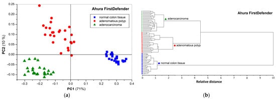 Figure 6 demonstrates the component score plots PC1 versus PC2 (left panels) and dendrograms of similarity (right panels) obtained via HCA using Ward’s clustering method and squared Euclidean distances. For all Raman devices, the combination of principal components PC1 and PC2 was found to demonstrate significant differences between the three samples. The best discrimination was observed for spectra measured with Ahura, where well-separated heap clusters of samples were formed. The normal colon tissue sample showed positive PC1 scores, while the corresponding scores of the two abnormal tissue samples were mostly negative. PC2 scores, in turn, separated adenomatous polyp and adenocarcinoma samples into positive and negative regions, respectively. In the case of i-Raman Plus spectra, PC1 partially separated the normal colon tissue sample, which showed negative values for this component, from the abnormal samples, which had mostly positive scores. In turn, PC2 separated the adenocarcinoma sample with negative score values from the remaining two samples. For DXR SmartRaman spectra, PC1 scores of adenocarcinoma fell below −40 and were, thus, separated from the other two samples having higher scores. PC2 separated normal colon tissue and adenomatous polyp, showing negative and mostly positive scores, respectively.