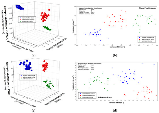SVM is an effective tool for classifying spectral data due to the following advantages [54,66]: (a) it produces a robust classifier that can work with small or limited-size datasets; (b) it uses a structural risk minimization (SRM) approach, which reduces the risk of overfitting the data; (c) it gives reproducible solutions when using the same classifier parameters; (d) it can draw class boundaries with complex conditions, replacing kernel functions. Three Raman datasets obtained from the laboratory, modular, and portable devices, which include 25 spectra for each group, were used as training datasets to perform SVM classification training to fully distinguish the three types of samples, i.e., normal colon tissue, adenomatous polyp, and adenocarcinoma. The scattergrams, characterizing the three Raman instruments, are shown in Figure 7b,d,f. All the obtained SVM classifications allowed us to distinguish between the three mentioned types of colon tissue.