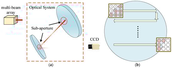 The principle of MASTS is illustrated in Figure 1a. The parallel beams with a small aperture emitted from the multi-beam array system pass through the optical system to be tested. The CCD camera, positioned at the focal plane of the system, captures the formed spots when the beams are focused by the optical system, which consists of a primary mirror and a secondary mirror. The wavefront slope information of the measured sub-aperture in the optical system can be calculated from the centroid coordinates of the focal spots. The multi-beam array system integrates 3 × 3 small-aperture collimator tubes that are maintained in the same direction to make their output beam parallel. The multi-beam array then scans through the entire aperture of the optical system under test to obtain its slopes’ information. The full-aperture aberration of the optical system is subsequently reconstructed using a wavefront reconstruction algorithm [,,]. One of the scanning paths is shown in Figure 1b, where the numbers indicate the identification of each sub-beam in the multi-beam array system, and the arrows indicate the scanning path of it.