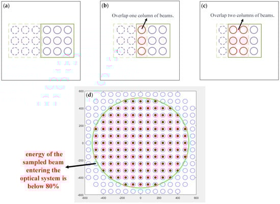 Schematic diagrams of array scanning way with (a) non-overlapping, (b) partially overlapping (one column), (c) extensively overlapping (two columns), and (d) schematic diagrams of sampled points distribution. (The dashed line in figure represents the position of a multi-beam array system before the scanning movement, while the solid line represents the position after the movement. The red circles indicate beams undergoing repeated sampling. In (d), the green circle represents the optical system aperture (1 m), and the blue circle with red dots indicates the effective sampled points).