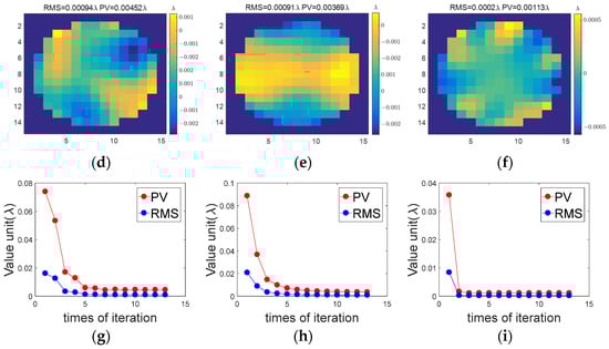 From Figure 5, it can be seen that the RMS values of the residual aberration obtained using the iterative method are all less than one-thousandth of a wavelength after the reconstructed wavefront is subtracted from the known aberration distribution. The RMS value shown in Figure 5c approaches one-ten-thousandth of a wavelength, which demonstrates the accuracy of the iterative method in simulation results. As the array scanning step size decreases, the aberration obtained through the iterative method becomes closer to the known aberration. Stated differently, reducing the step size enhances the accuracy of the iterative method and reduces the number of iterations needed for convergence. This is attributed to the fact that a smaller scanning step size brings adjacent measurement positions of the multi-beam array closer, resulting in a denser sampling of beams. As a consequence, more data are collected, and a larger dataset implies more accurate fitting results for Equations (5) and (6). Additionally, the averaging method proposed in reference [] assumes the wavefront in the optical system is uniformly sampled by an individual beam. It calculates the average of a large amount of multi-beam pointing error data based on statistical principles to eliminate sub-aperture aberration signals. But, a larger reconstruction error will be induced. The residuals after subtracting the reconstructed wavefront distribution using the averaging method from the preset aberrations are shown in Figure 6.