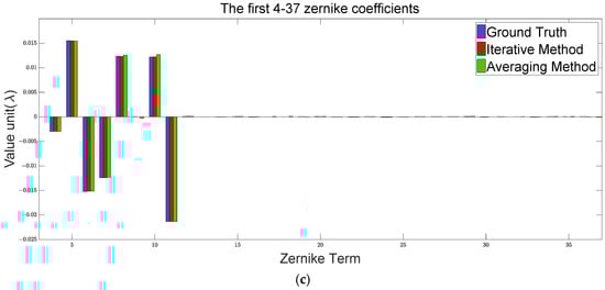 Under the same conditions, the residuals of the iterative method are significantly smaller than those of the averaging method, as shown in Figure 6. Figure 7 illustrates the comparison among the ground truth of aberration, the result using the iterative method, and the result using the averaging method with the coefficients of Zernike polynomial.