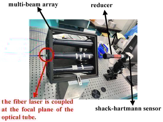 The beams emitted by the multi-beam array system developed in our lab have a wavelength of 632.8 nm and a beam size of 50 mm in diameter. The interval of adjacent beams in the multi-beam array system is 80 mm. Guided by the Shack–Hartmann wavefront sensor in the setup as shown in Figure 8, we achieved a wavefront error of less than 0.02 λ RMS for each collimator beam in the multi-beam array system. The laser is a single-mode fiber-coupled laser with a fiber output power exceeding 10 mW. Some characteristics of the Shack–Hartmann sensor are presented in Table 2. Note that the beam size, with a diameter of 50 mm, emitted by the multi-beam array, is reduced through a reducer to match the field of view of the Shack–Hartmann wavefront sensor.