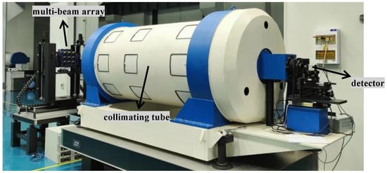 Next, a Cassegrain-type collimating tube with a focal length of 20 m is employed to align the nine beams in the same direction, as shown in Figure 9. Each beam of the multi-beam array system is sequentially focused on the CCD using the collimating tube. We adjust the nine focal spots to align as closely as possible at the same position. However, due to the limitations of mechanism, the centroids of the spots did not exactly coincide at the same coordinates.