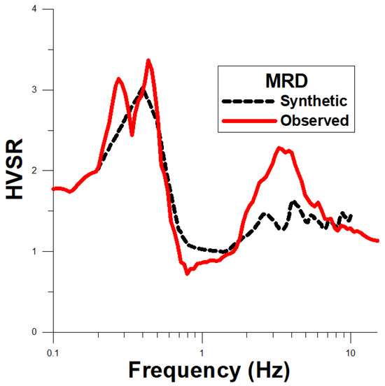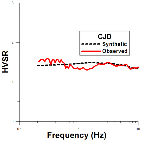 Observed and synthetic HVSRs of CJD site; the red line indicates the observed curve, and the black dotted line indicates the synthetic curve.