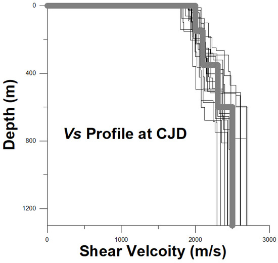 - The basement depth in the Jeju region varies from 590 m to 810 m below the surface, with a broad range of values observed. Excluding the UDO site, the basement depths of the other seven sites fall within a more confined range of 590–710 m, demonstrating a relatively narrow range of basement depths. The CJD site, characterized by a geologically distinct tectonic structure, was included primarily for comparison. The Vs profile at the CJD site distinctly differed from the eight Jeju sites in terms of the shear velocity and the absence of an LVL structure, thereby enhancing the reliability of this research.