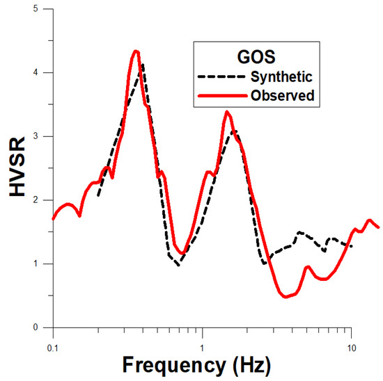 Observed and synthetic HVSRs of GOS site; the red line indicates the observed curve, and the black dotted line indicates the synthetic curve.