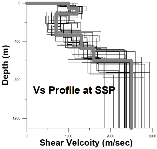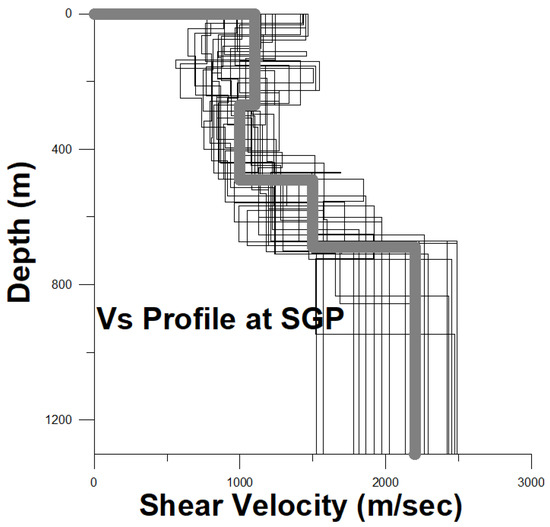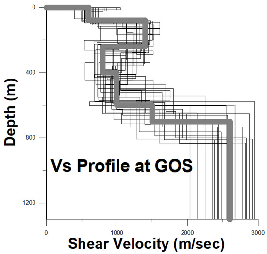 The Vs profile revealed a marked increase in velocity at depths of 70–90 m, with the velocities ranging from 500 to 700 m/s. This sharp velocity increase can be interpreted as a transition from surface sedimentary outcrops to a rock mass. Utilizing the site classification from the national building code based on the shear-wave velocity, as delineated in Table 5, the outcrops at the GOS sites with velocities of 500–700 m/s were classified as SC. Beyond this, the velocity, ranging from 1300 to 1500 m/s, remained relatively constant up to depths of 230–250 m [44].