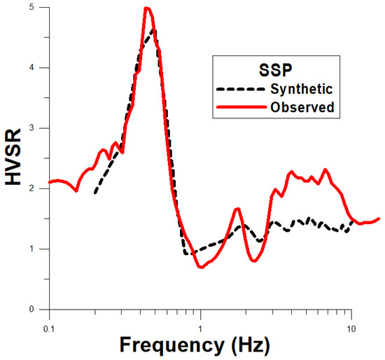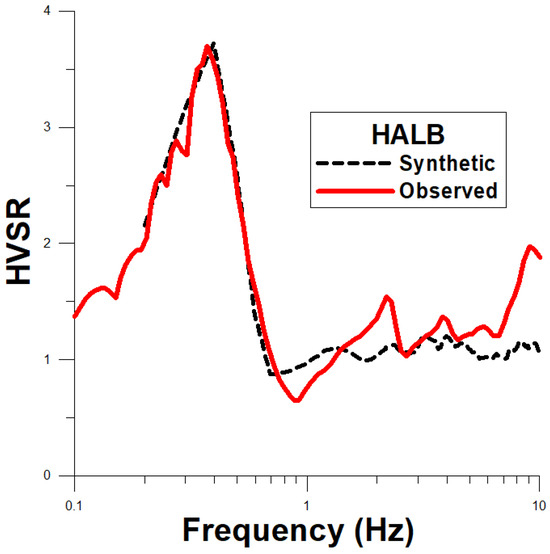 Observed and synthetic HVSRs of HALB site; the red line indicates the observed curve, and the black dotted line indicates the synthetic curve.