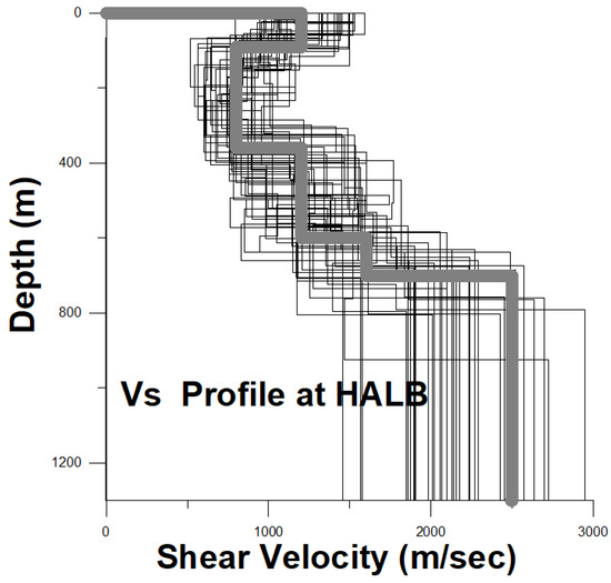 The Vs models at the HALB site indicate an abrupt reduction in velocity from 1100 to 1300 m/s to 700–900 m/s at depths of 80–100 m. This shift is interpretable as a transition from the surface rock mass to the LVL. Applying the site classification method based solely on the outcrop shear-wave velocity, as indicated in Table 5, the outcrops at the HALB sites (1100–1300 m/s) were categorized as SB. The LVL remained nearly consistent at depths of 350–370 m. As the depth increased to 590–610 m, a velocity increment was observed, followed by an encounter with the basement at depths of approximately 690–710 m [45].