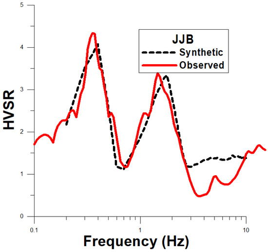 Observed and synthetic HVSRs of JJB site; the red line indicates the observed curve, and the black dotted line indicates the synthetic curve.