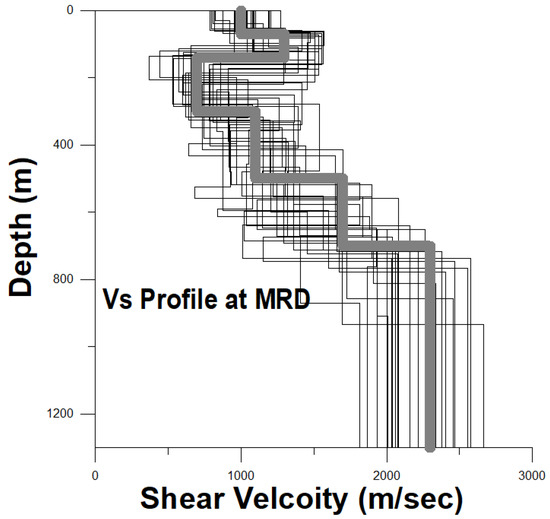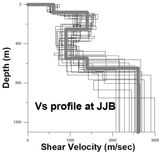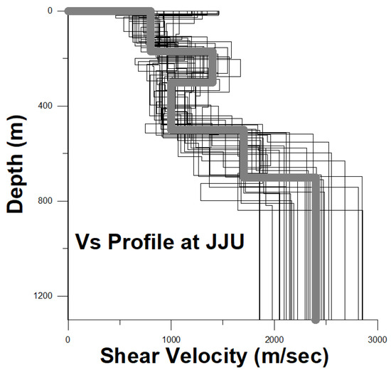Figure 11 displays the Vs profiles at the JJU site, showcasing both the inverted and optimal Vs models. In determining the optimal shear velocity profile, greater emphasis was placed on the darker segments, which represent the more frequently mapped areas. The first layer formed a velocity range of 700–900 m/s up to a depth of 160–180 m. Utilizing the site classification method based on the surface shear-wave velocity, as indicated in Table 5, the outcrops at the JJU sites (700–900 m/s) were classified as SB. The second layer, with velocities of 1300–1500 m/s, extended from 160–180 m to depths of 290–310 m. The third layer began with a slightly lower velocity of 900–1100 m/s, averaging a reduction of 400 m/s, and extended to depths of 490–510 m. This layer, exhibiting lower velocities, was consistent with the typical LVL identified across the Jeju region compared to the upper and lower strata. Finally, the velocity significantly increased to 2300–2500 m/s at depths of 690–710 m, indicative of the deep basement [45].