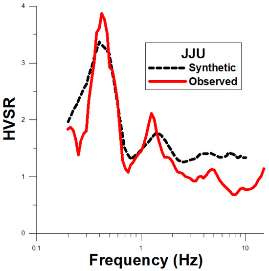 Observed and synthetic HVSRs of JJU site; the red line indicates the observed curve, and the black dotted line indicates the synthetic curve.