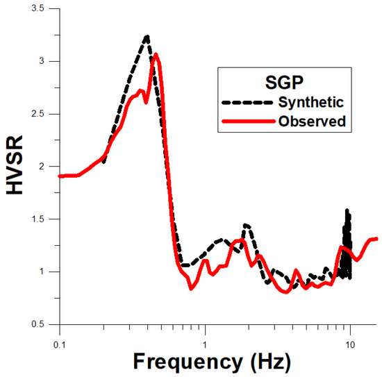 The HALB site, situated on the western part of Jeju Island, exhibited characteristics similar to those of the GOS site (Figure 1). Figure 6 presents the observed and synthetic HVSR curves for the optimal Vs structure model at the HALB site. The observed HVSR curve demonstrated a significant peak at a frequency of 0.37 Hz, with a corresponding peak amplitude of 3.70, as noted in Table 4.