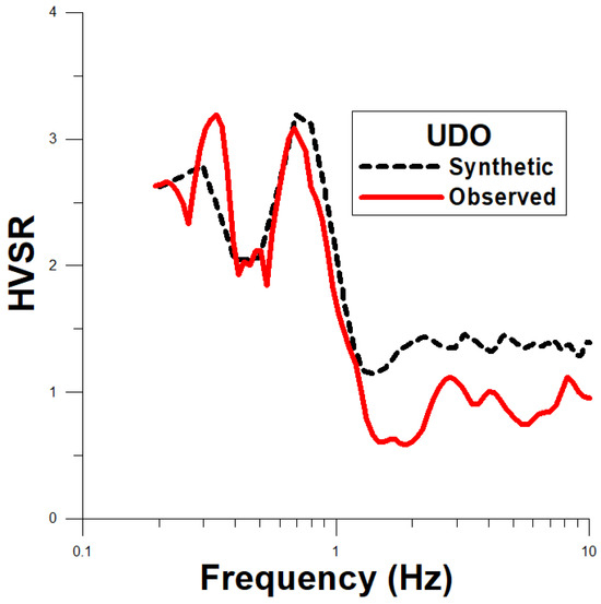 Observed and synthetic HVSRs of UDO site; the red line indicates the observed curve, and the black dotted line indicates the synthetic curve.