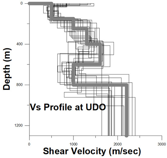 Figure 19 displays the Vs profile at the UDO site, showing all the inverted and optimal Vs models. The profile revealed a layer up to depths of approximately 140–160 m with velocities ranging from 400 to 600 m/s. By employing the site classification method on the outcrop shear-wave velocity, as indicated in Table 5, the outcrops at the UDO sites (1100–1300 m/s) were categorized as SC, ranking it as the softest site class among the nine sites investigated. The second layer, extending to depths of 240–260 m, exhibited velocities of 900–1100 m/s. The third layer, characterized by velocities of 1200–1400 m/s, extended to depths of 390–410 m. The fourth layer, with velocities of 1500–1700 m/s, extended to depths of 590–610 m. Subsequently, the fifth layer, identified as the LVL with velocities of 900–1100 m/s, extended to depths of 790–810 m. This LVL displayed a significant velocity contrast of around 600 m/s on average compared to the overlying layer. Finally, the velocity increased remarkably, connecting to the basement at depths of 2100–2300 m/s [45].