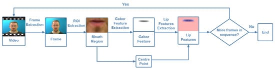 Flowchart of the lip feature extraction system showing frame extraction, ROI identification and extraction, Gabor transform, and lip feature extraction.