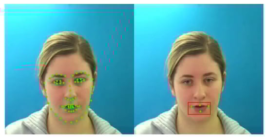 Given a sequence of images (where ) extracted from a video file, the widely used Dlib toolkit [50], along with a trained model file, Shape-Predictor-68-Face-Landmarks, used in previous research by the authors [3,11], is used to identify 68 landmark face features. To detect the mouth region (ROI), four features are selected, represented by four x and y coordinate pairs and , respectively, and , the centre point of the ROI (mouth region), is calculated as shown in Figure 2.