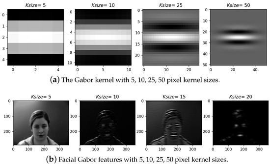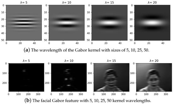 : When varying , the size of the convolution kernel varies. Figure 4 shows example results when applying with 5, 10, 25, 50 pixels. As shown in Figure 4b, when = 15, more efficient information about facial features can be extracted. That means a proper Gabor parameter is vital for feature extraction.