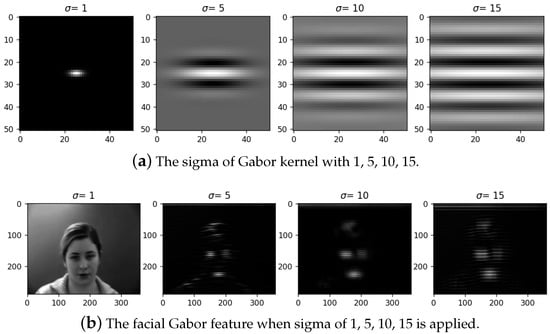 Standard deviation of the Gaussian envelope (): The sigma parameter () controls the overall size of the Gabor envelope. For larger values of , the envelope increases, allowing more stripes, and with smaller sigma values, the envelope tightens. Figure 7 shows that with increasing sigma values from 1 to 15, the number of stripes in the Gabor function increases. In Figure 7b, it can be seen that when , more stripes can be seen in the features of the eyes.